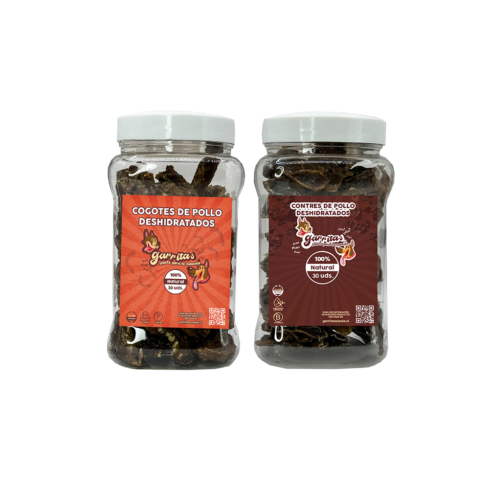 Incluye: 1 Tarro de cogotes de pollo de 30 unidades y 1 Tarro de Contres de pollo de 30 unidades