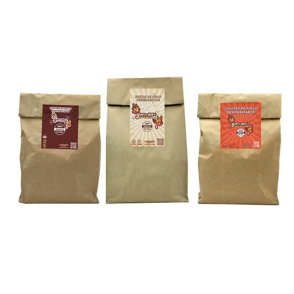 Incluye: 1 Recarga de patitas de pollo de 30 unidades, 1 Recarga cogotes de pollo de 30 unidades y 1 Recarga Contres de pollo de 30 unidades